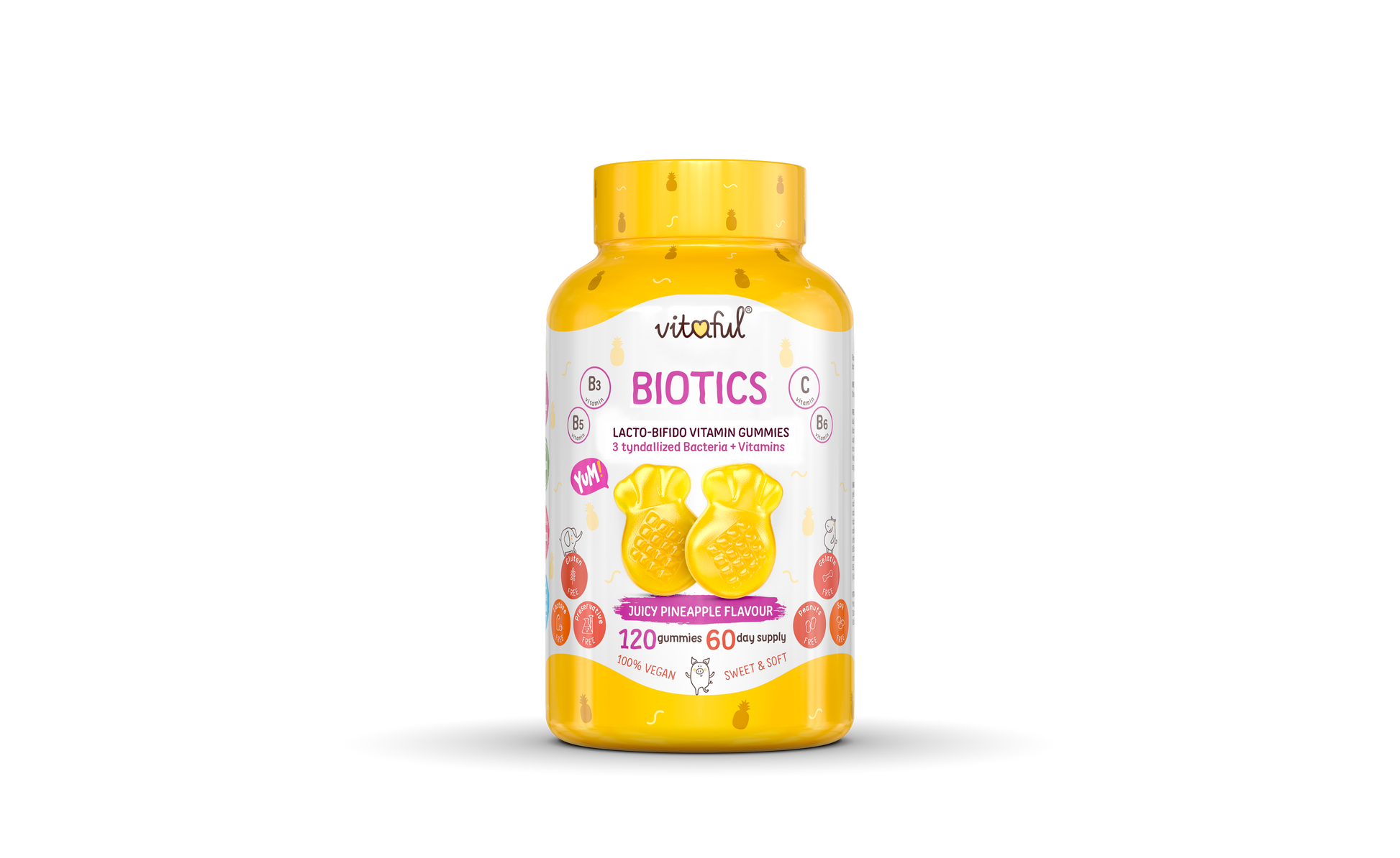A Vitaful BIOTICS zselés étrend-kiegészítő gumivitamin 3 tindalizált baktériumtörzset és 4 vitamint tartalmaz.